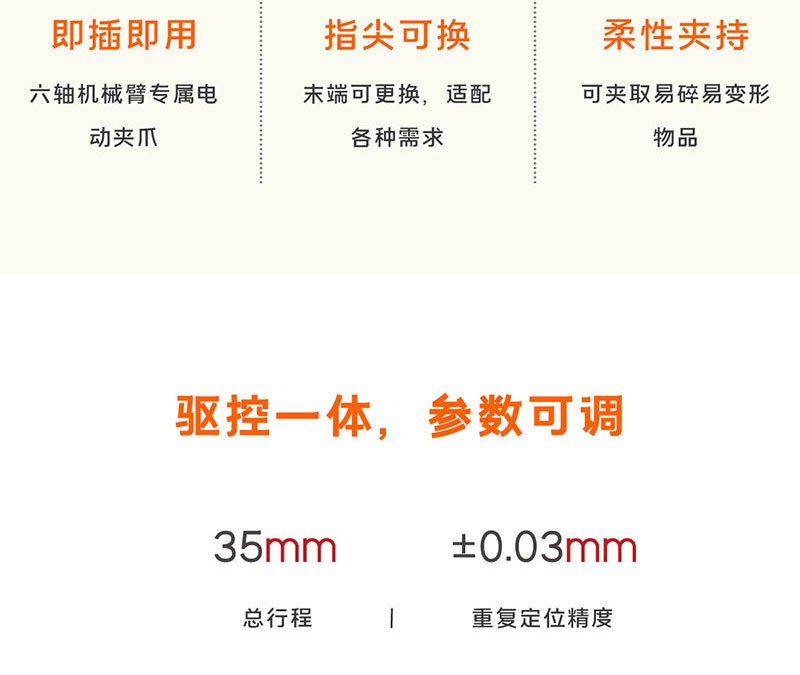 慧靈電動夾爪Z-EFG-C35,行程35mm,夾持力50N,兼容六軸協作機械臂,是一款集伺服系統于一體,即插即用的六軸機械臂電爪,單向運動最短時間為0.5s,可以滿足產線高速穩定的夾持需求!