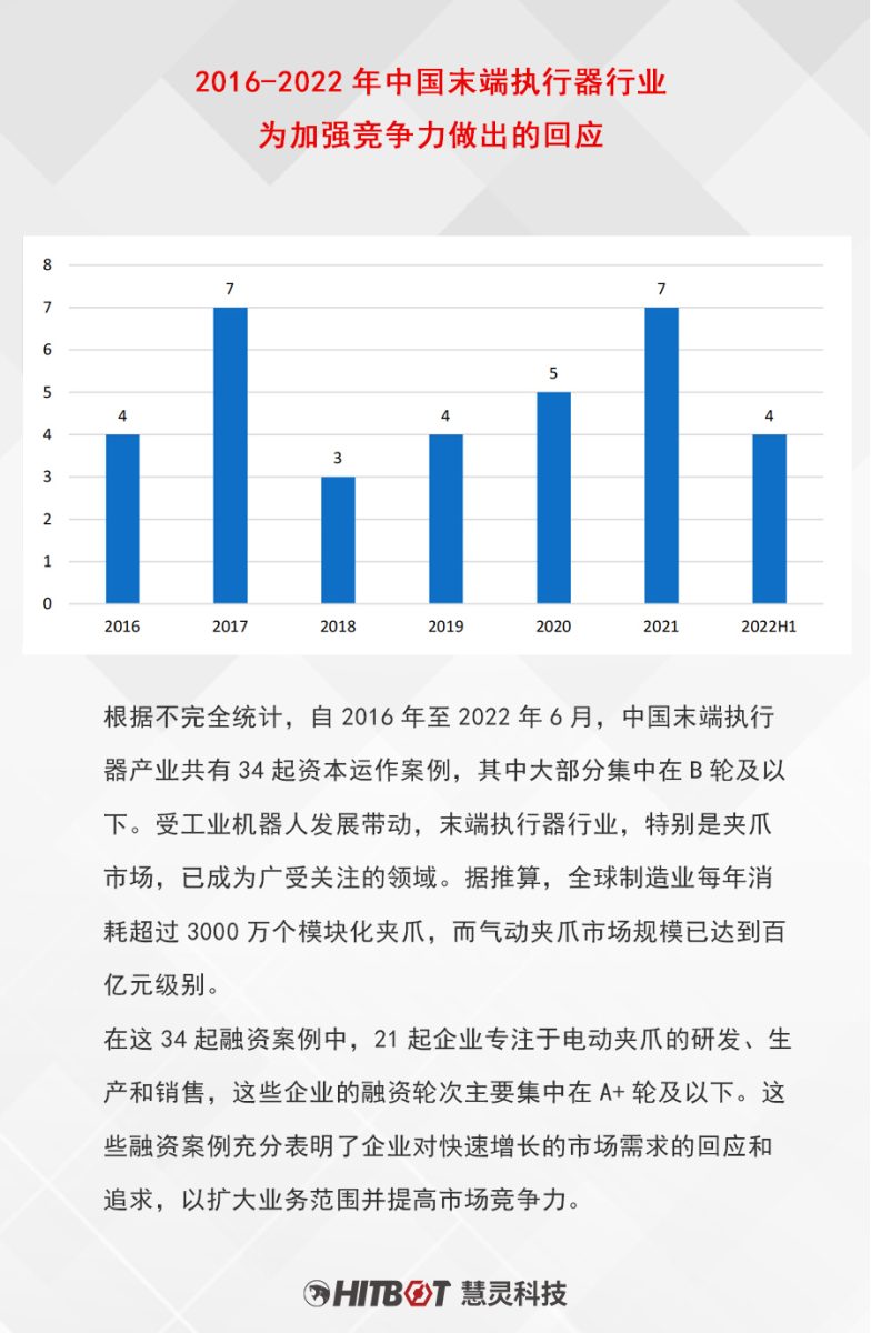 根據不完全統計,自2016年至2022年6月,中國末端執行器產業共有34起資本運作案例,其中大部分集中在B輪及以下。受工業機器人發展帶動,末端執行器行業,特別是夾爪市場,已成為廣受關注的領域。據推算,全球制造業每年消耗超過3000萬個模塊化夾爪,而氣動夾爪市場規模已達到百億元級別。