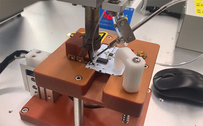 載板檢測—載板定位—自動出膠—自動點(diǎn)膠—載板輸送