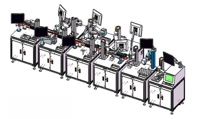 可單機(jī)控制操作,也可整線聯(lián)合使用;系統(tǒng)從溫度計原料上料開始,進(jìn)行點(diǎn)膠、磁鐵組裝、焊錫、鎖螺絲、搬運(yùn)、組裝壓合、激光打標(biāo),最后下料產(chǎn)出一個完整定制化產(chǎn)品。
