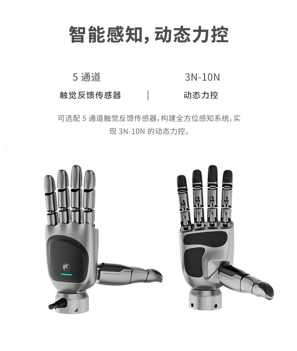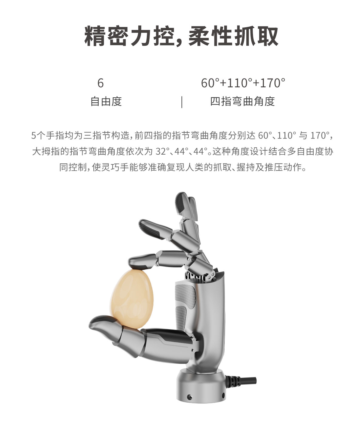 2025年5月13日 pruce 靈巧手, 電動夾爪 0 eHand-6 首頁 / 電動夾爪 / eHand-6 播放視頻 自由度:精準復刻人類抓、捏、握、推動作 負載能力:抓握力最大可達10N,提拉載荷能力高達5kg 毫秒級響應:1.1s完成復雜手勢,速度與穩定性兼得 智能感知:可選配5通道觸覺反饋傳感器 開發兼容性:提供Python/ROS雙API接口 下載3D模型 下載產品手冊 播放視頻 自由度:精準復刻人類抓、捏、握、推動作 負載能力:抓握力最大可達10N,提拉載荷能力高達5kg 毫秒級響應:1.1s完成復雜手勢,速度與穩定性兼得 智能感知:可選配5通道觸覺反饋傳感器 開發兼容性:提供Python/ROS雙API接口 下載3D模型 下載產品手冊 產品描述 資料下載 產品描述 eHand-6 核心參數?61.1s自由度節拍10N10N拇指最大抓握力四指最大抓握力5kg小于800g提拉載荷本體重量*安裝尺寸圖規格參數?詳情產品型號eHand-6自由度6節拍1.1s完成手勢動作四指彎曲角度60°+110°+170°拇指彎曲角度32°+44°+44°拇指側擺角度70°拇指最大抓握力10N四指最大抓握力10N提拉載荷5kg重量<800g傳動方式空心杯電機+行星減速機+絲桿+連桿尺寸220*88*52mm通訊協議CAN FD工作電壓24VDC±10%備注:由于產品不斷推新迭代,產品參數如有變更,恕不另行通知。 資料下載 點擊下載產品手冊點擊下載3D圖點擊下載運動范圍圖 eHand-6 核心參數 產品詳細參數 產品型號eHand-6自由度6節拍1.1s完成手勢動作四指彎曲角度60°+110°+170°拇指彎曲角度32°+44°+44°拇指側擺角度70°拇指最大抓握力10N四指最大抓握力10N提拉載荷5kg重量<800g傳動方式空心杯電機+行星減速機+絲桿+連桿尺寸220*88*52mm通訊協議CAN FD工作電壓24VDC±10%備注:由于產品不斷推新迭代,產品參數如有變更,恕不另行通知。 產品詳情 相關產品