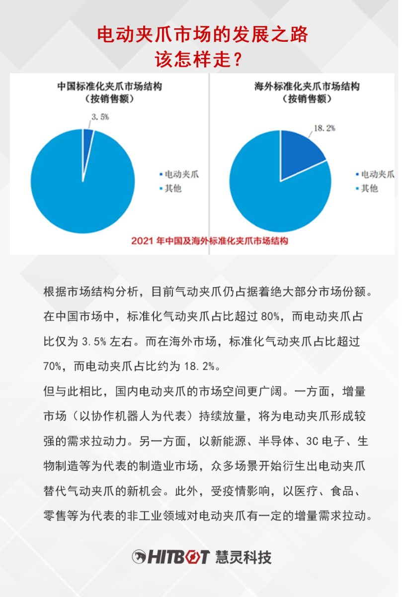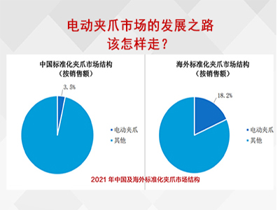 根據(jù)市場結(jié)構分析,目前氣動夾爪仍占據(jù)著絕大部分市場份額。在中國市場中,標準化氣動夾爪占比超過80%,而電動夾爪占比僅為3.5%左右。而在海外市場,標準化氣動夾爪占比超過70%,而電動夾爪占比約為18.2%。