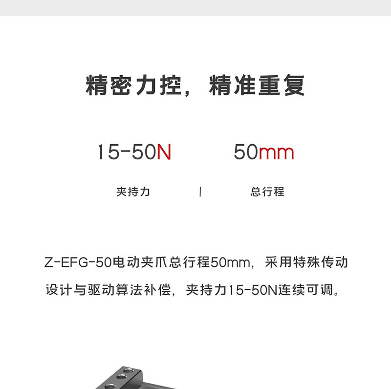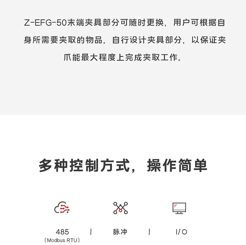 慧靈HITBOT,電動夾爪Z-EFG-50通過Modbus精準控制力、位、速度,結構緊湊、支持五種以上靈活安裝方式,控制器內置,占用空間小,能輕松應對多種夾持任務需求!