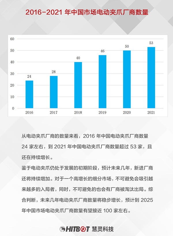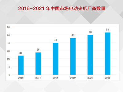 電動夾爪廠商的數量來看,2016年中國電動夾爪廠商數量24家左右,到2021年中國電動夾爪廠商數量超過53家,且還在持續增長。
