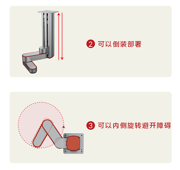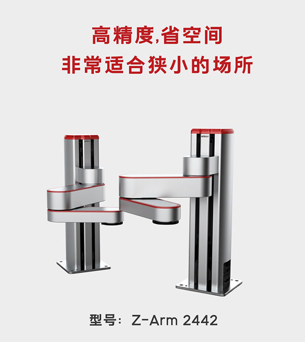 Z-Arm 2442四軸協作式機器人1軸臂長220mm,旋轉角度±90°,2軸臂長200mm,旋轉角度±164°,Z軸行程240mm (高度可定制),R軸旋轉范圍±1080°。產品非常適合放置在工作臺上或內置于機械內部,是輕型裝配操作任務的理想之選。