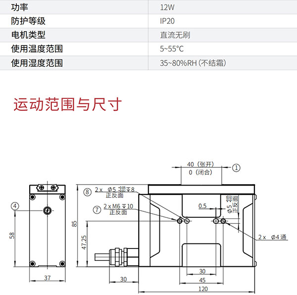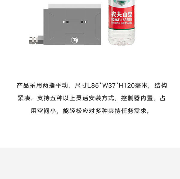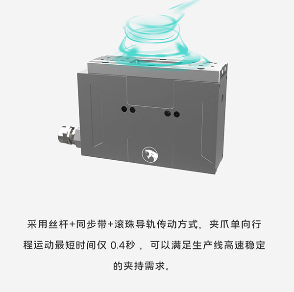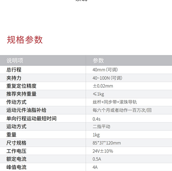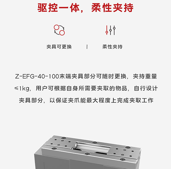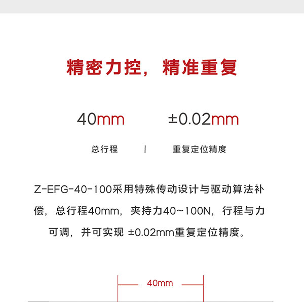 Z-EFG-40-100采用特殊傳動設計與驅動算法補償,總行程40mm,夾持力40~100N,行程與力可調,并可實現±0.02mm重復定位精度,快速響應, 又快又穩,適用于狹小的工作環境!