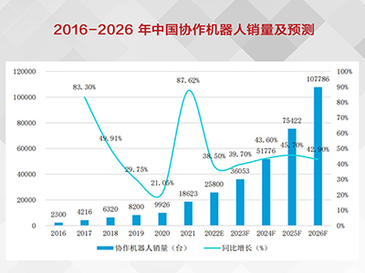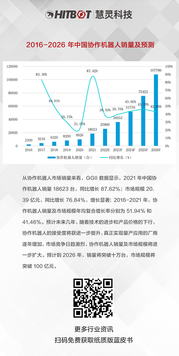 從協作機器人市場銷量來看, GGII 數據顯示,2021年中國協作機器人銷量18623臺,同比增長87.62%;市場規模20.39億元,同比增長76.84%,增長顯著;2016-2021年,協作機器人銷量及市場規模年均復合增長率分別為51.94%和41.46%。預計未來幾年,隨著技術的進步和產品價格的下行,協作機器人的接受度將獲進一步提升,真正實現量產應用的廠商逐年增加,市場競爭日趨激烈,協作機器人銷量及市場規模將進一步擴大。預計到2026年,銷量將突破十萬臺,市場規模將突破100億元。