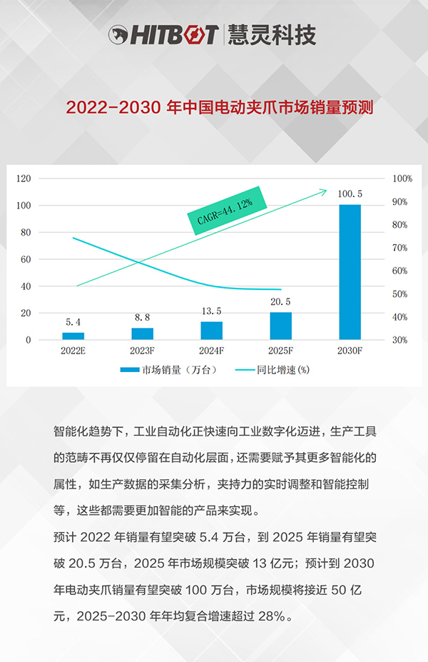 GGII 預計 2022 年銷量有望突破 5.4 萬臺,到 2025 年銷量有望突破 20.5 萬臺,2025年市場規模突破 13 億元;預計到 2030 年電動夾爪銷量有望突破 100 萬臺,市場規模將接近 50 億元,2025-2030 年年均復合增速超過 28%。