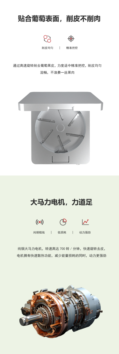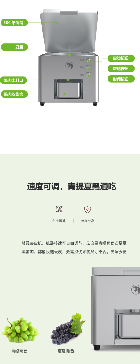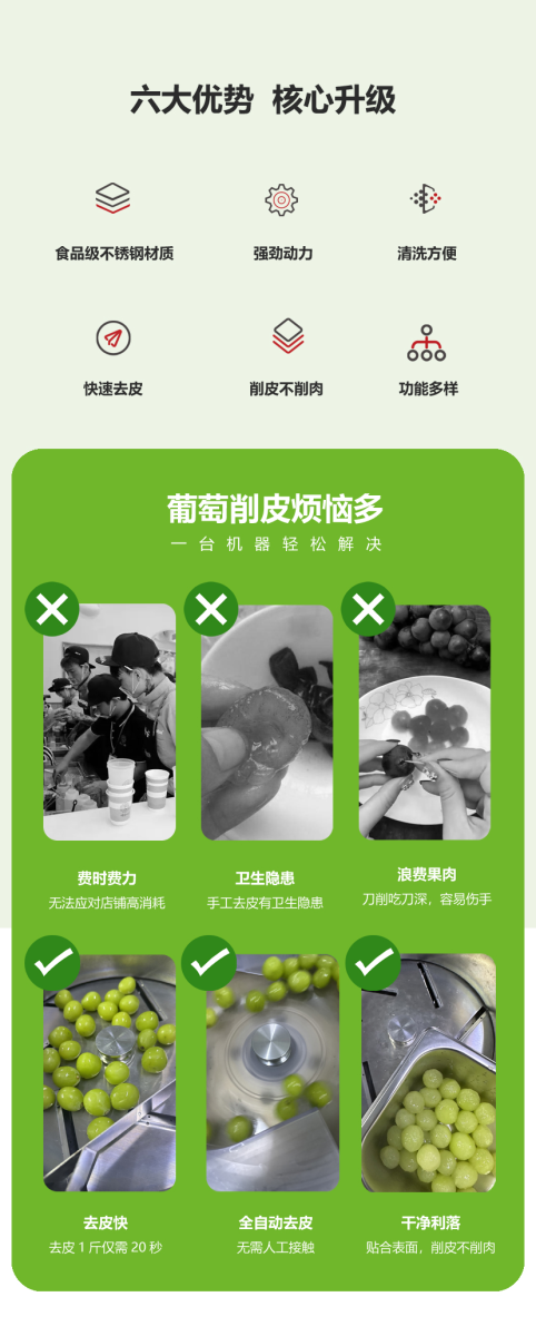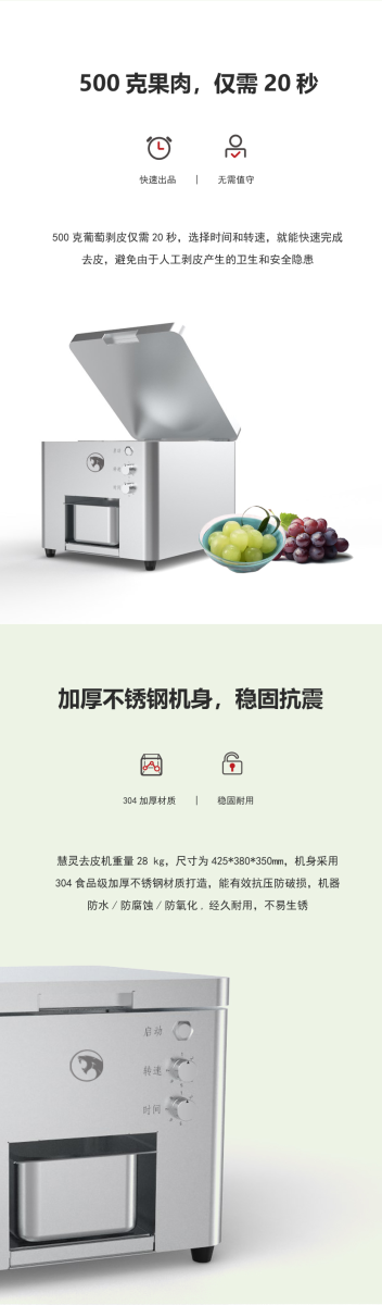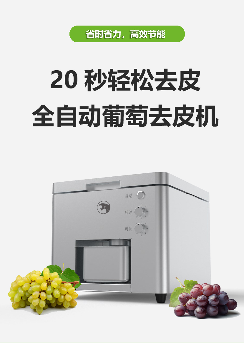 • 該葡萄剝皮機可對物料去皮以高度還原人工剝皮的效果,不僅提高了物料的去皮效率還能保證去皮過程更加衛生;