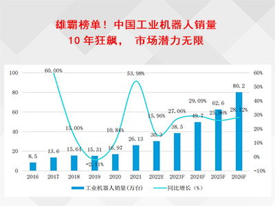 中國工業機器人市場蓬勃發展,尤其是國內頭部廠商,同比增速超過100%!整體市場呈現同比上升趨勢,全年銷量達26.13萬臺,同比增速超50%!預計到2026年,銷量將超過80萬臺!