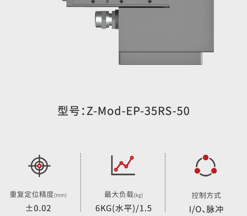 2023年1月10日 Lu, DongWu 智能電缸 0 Z-Mod-EP-35RS-50 首頁 / 智能電缸 / Z-Mod-EP-35RS-50 體積小、推力大 、高精度、性價比高驅(qū)動內(nèi)置,簡單易操作末端抗彎能力強(qiáng)力、位置、速度都可以通過Modbus精準(zhǔn)控制長壽命:千萬次循環(huán),超越氣缸控制方式:485、I/O、脈沖 下載3D模型 下載產(chǎn)品手冊 體積小、推力大 、高精度、性價比高驅(qū)動內(nèi)置,簡單易操作末端抗彎能力強(qiáng)力、位置、速度都可以通過Modbus精準(zhǔn)控制長壽命:千萬次循環(huán),超越氣缸控制方式:485、I/O、脈沖 下載3D模型 下載產(chǎn)品手冊 產(chǎn)品描述 資料下載 產(chǎn)品描述 Z-Mod-EP-35RS-50 核心參數(shù) 1-2mm 280N? 導(dǎo)程 最大連續(xù)推壓力 50mm ? ? ? ? ? ? ? ? ? ? ? ? ? ?±0.02mm 行程 ? ? ? ? ? ? ? ? ? ? ? ? ? ? ? ? ? ? ? ? ? ? ? ?重復(fù)定位精度 *線框尺寸圖 規(guī)格參數(shù) 型號性能 行程 50mm 導(dǎo)程 1mm 2mm 最大速度 50mm/s 100mm/s 最大連續(xù)推壓力 280 150N 最大負(fù)載質(zhì)量 水平:6kg / 垂直:1.5kg 水平:3kg / 垂直:1.5kg 重復(fù)定位精度 ±0.02mm 力控精度 ±10% 推桿不旋轉(zhuǎn)精度 ±1.5° 推桿末端允許力矩 1N·m 整機(jī)重 0.8kg 尺寸規(guī)格 160*40*86mm 控制方式 I/O控制、485總線控制、脈沖控制(脈沖+方向) 工作電壓 DC24V±10% 額定電流 2A 峰值電流 6A 防護(hù)等級 IP40 使用環(huán)境 0~40℃,85% RH以下(不結(jié)霜) 資料下載 點(diǎn)擊下載產(chǎn)品手冊 點(diǎn)擊下載3D圖 點(diǎn)擊下載運(yùn)動范圍圖 Z-Mod-EP-35RS-50核心參數(shù) 產(chǎn)品詳細(xì)參數(shù) 行程50mm導(dǎo)程1mm2mm最大速度50mm/s100mm/s最大連續(xù)推壓力280N150N最大負(fù)載質(zhì)量水平:6kg / 垂直:1.5kg水平:3kg / 垂直:1.5kg重復(fù)定位精度±0.02mm力控精度±10%推桿不旋轉(zhuǎn)精度±1.5°推桿末端允許力矩1N·m整機(jī)重0.8kg尺寸規(guī)格160*40*86mm控制方式I/O控制、485總線控制、脈沖控制(脈沖+方向)工作電壓DC24V±10%額定電流2A峰值電流6A防護(hù)等級IP40使用環(huán)境0~40℃,85% RH以下(不結(jié)霜) 產(chǎn)品詳情 相關(guān)產(chǎn)品